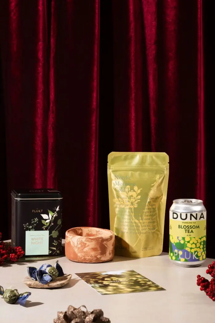 Dāvanu komplekts, kurā katrs atradis kāroto – mūsuprāt, izcili piemērots pasniegšanai ģimenei vai kolektīvam. Iekļauti divi PLŪKT tējas maisījumi, kā arī ugunspuķes “mača” tējas trifeles gatavotas kopā ar Pure Chocolate, dzirkstošā tēja un mākslinieces radīta keramikas krūzīte un tējas maisiņa paliktnītis. Komplekts ir eleganti iesaiņots dizaina dāvanu kastē ar dekoratīvo pildījumu un pastkarti personalizētam sveicienam.